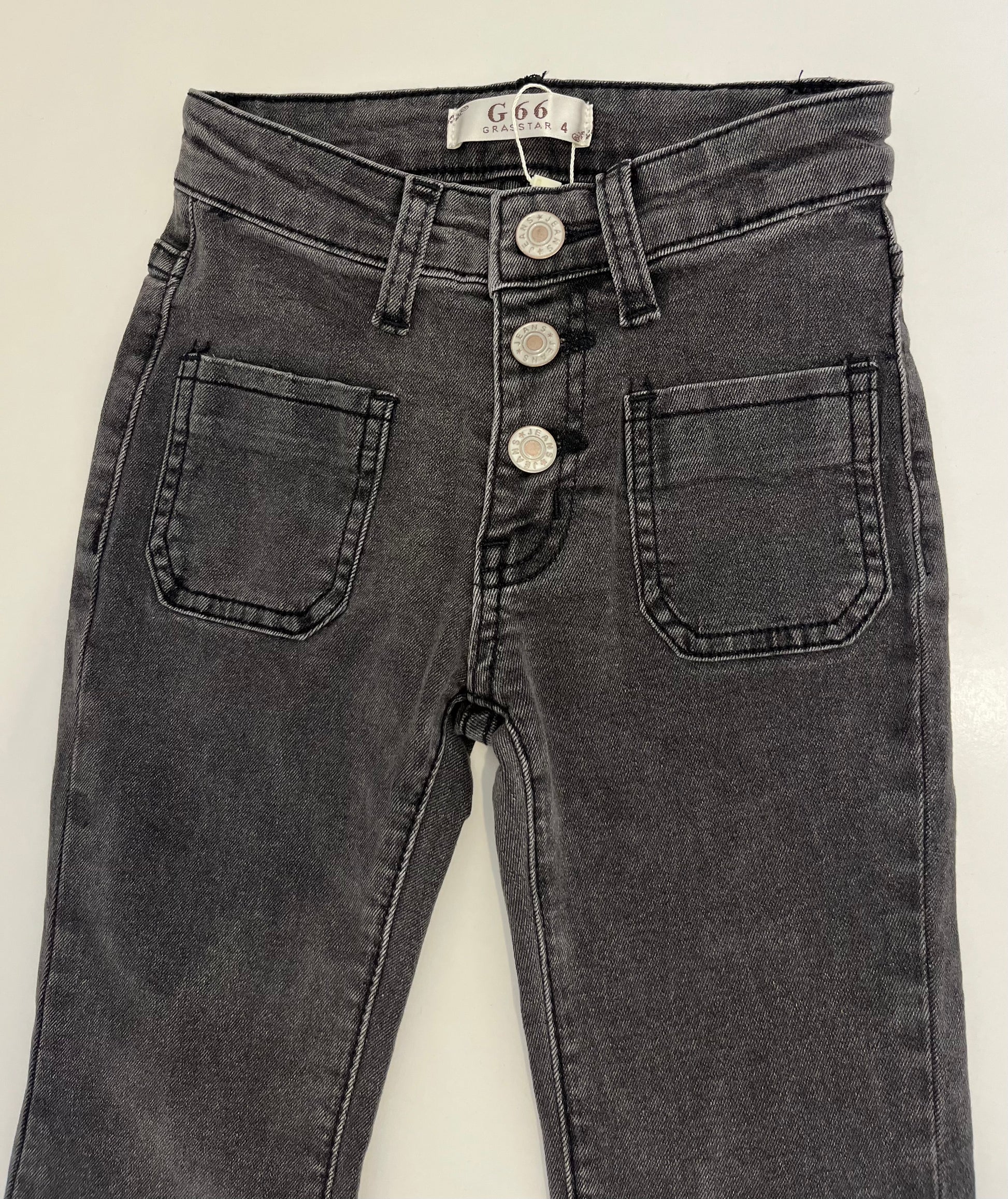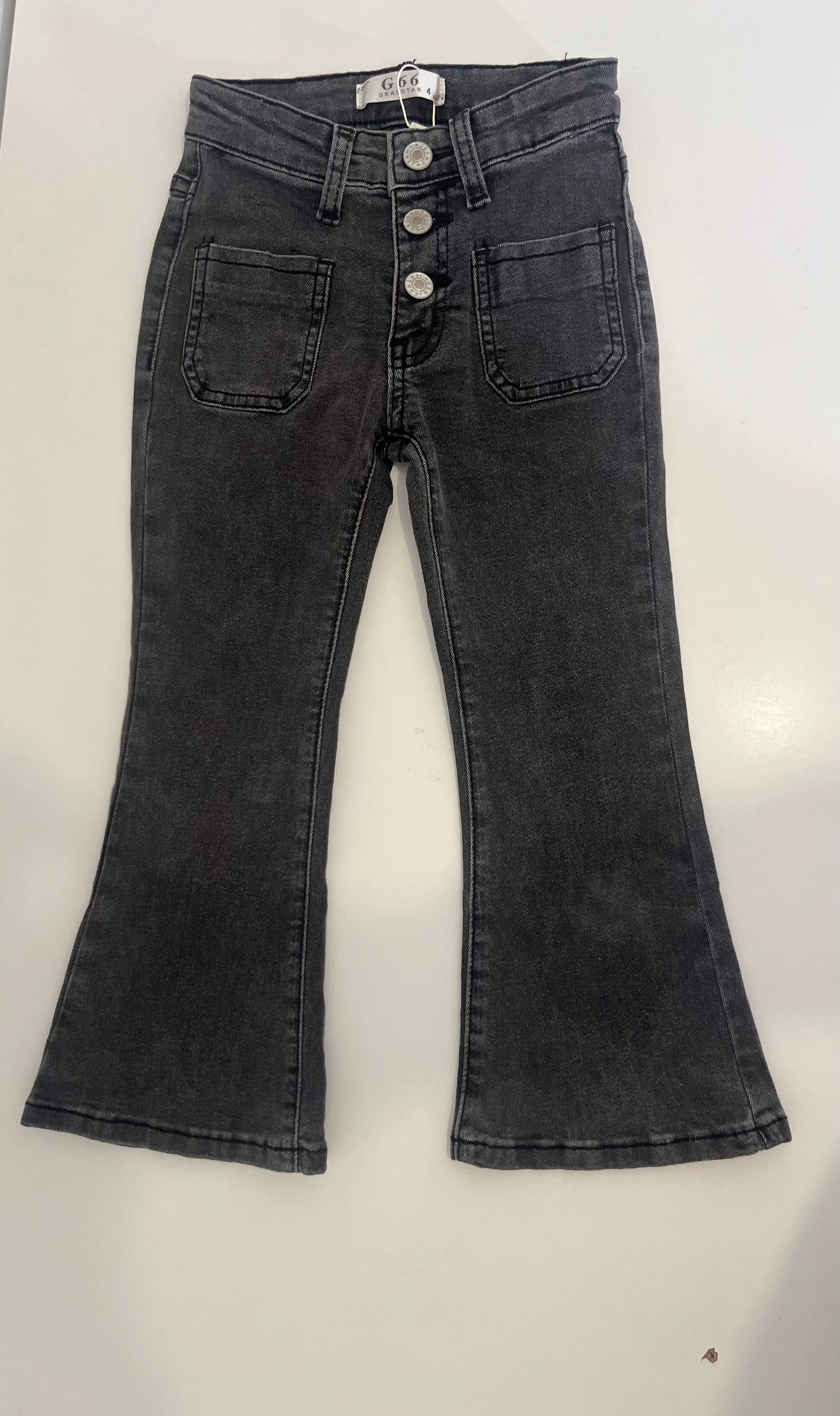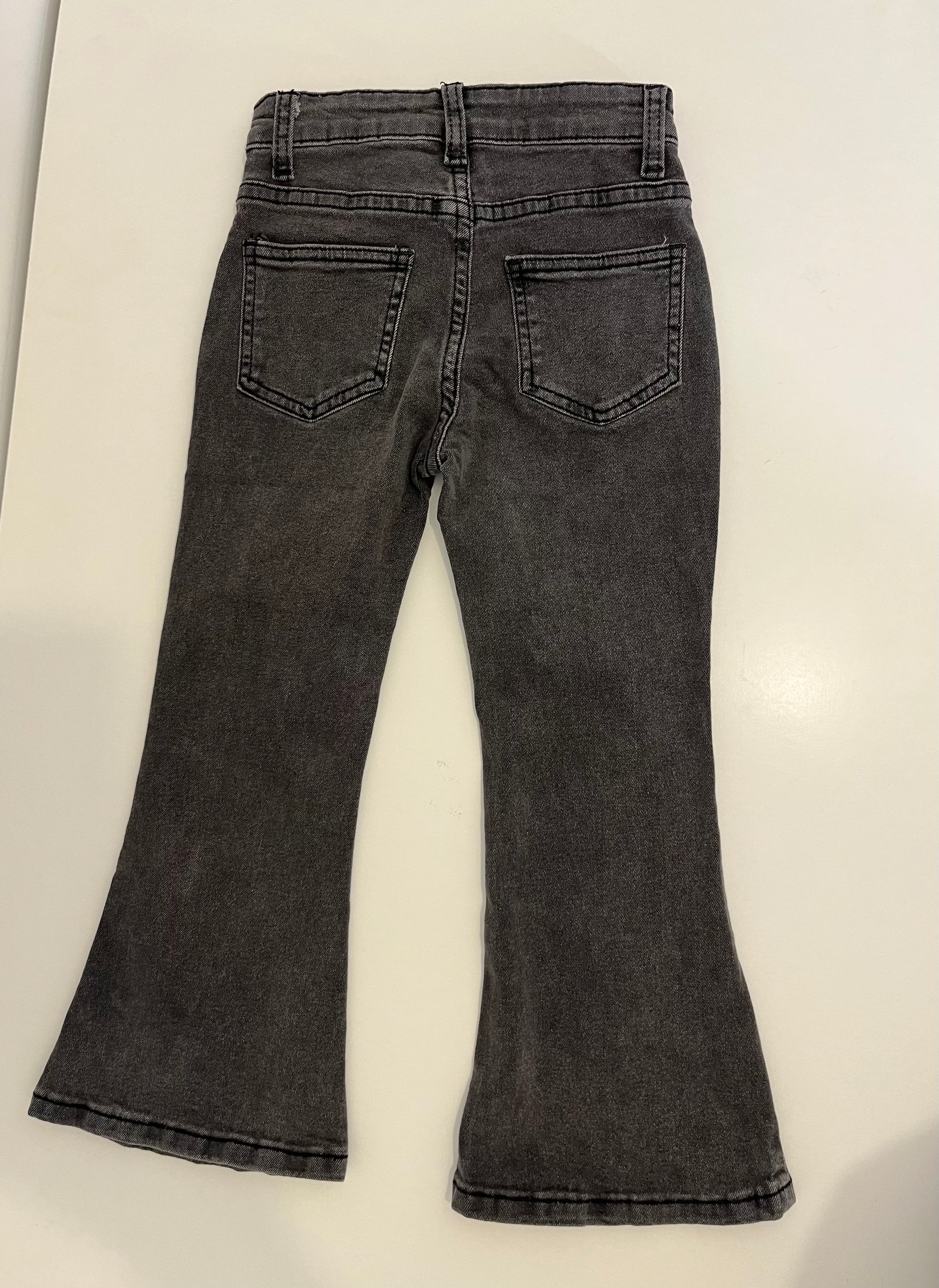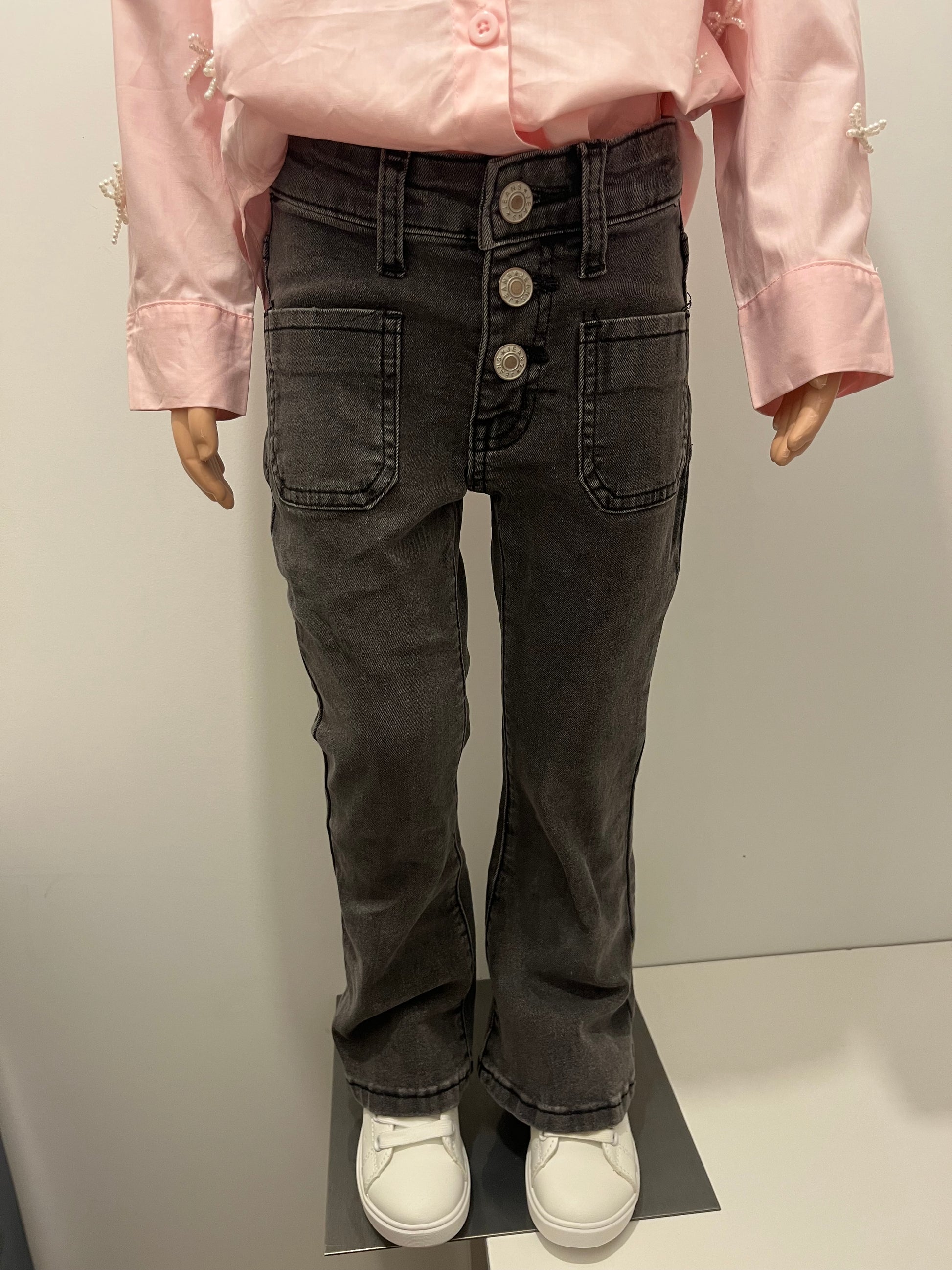 Jean noir/gris patte d'éléphant, taille mi haute pour un look élégant et tendance. Conçu dans une toile denim douce et stretch, ce qui assure une liberté de mouvement optimale. Parfait pour le quotidien comme pour les sorties.